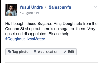 I thought it worth a shot and so, once I was back at my desk and had explained the situation to my colleagues, I took photos of the offending doughnuts, reactivated my Twitter account and posted a photo tagging Sainsburys: